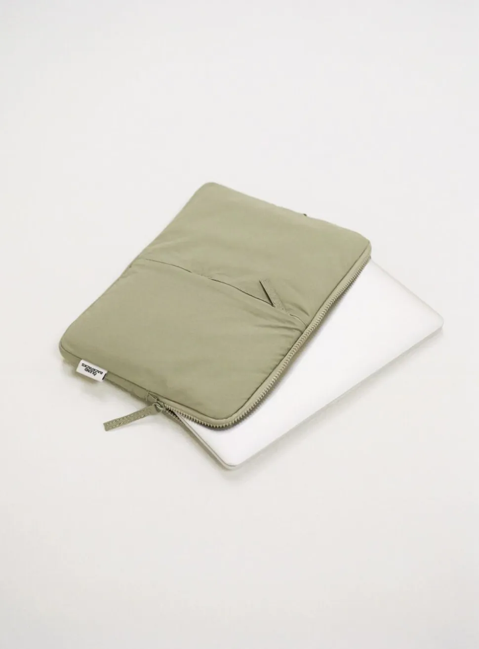 Blødt og polstret cover til bærbar computer med en lynlåslomme foran.