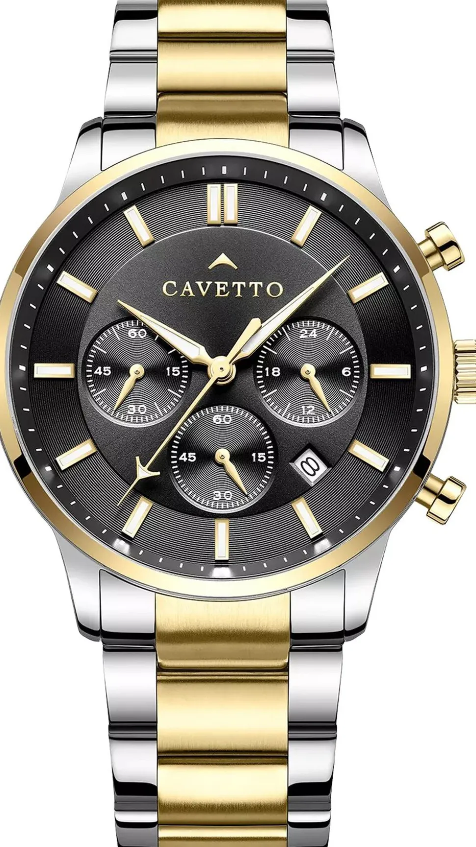 Cavetto Pantheon CV0005 kombinerer imponerende design med praktiske funktioner. Dette ur har en rund urskive med en tekstureret overflade, der tilføjer dybde til udseendet. Den sorte urskive komplementeres af en sølv urkasse og bezel, hvilket skaber et klassisk look. Tre kronografer er symmetrisk placeret og forbedrer urets balancerede design. Lænken i rustfrit stål har skiftevis guld og sølv led, hvilket giver et moderne touch. Foldelåsen sikrer en sikker pasform, hvilket gør det komfortabelt til daglig brug.
