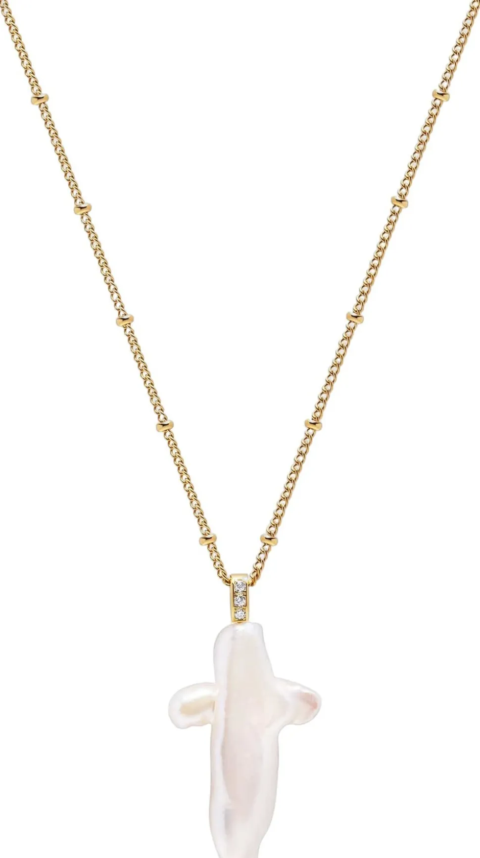 Pearl Cross Chain Necklace til kvinder med en unik, naturlig perle, der er formet som et kors som midtpunkt. Vi bruger dyrkede perler fra østers og ferskvandsmuslinger, som vi håndvælger til alle vores smykker. Låsen er lavet af rustfrit stål med 18k guldbelægning. Håndlavet i Los Angeles