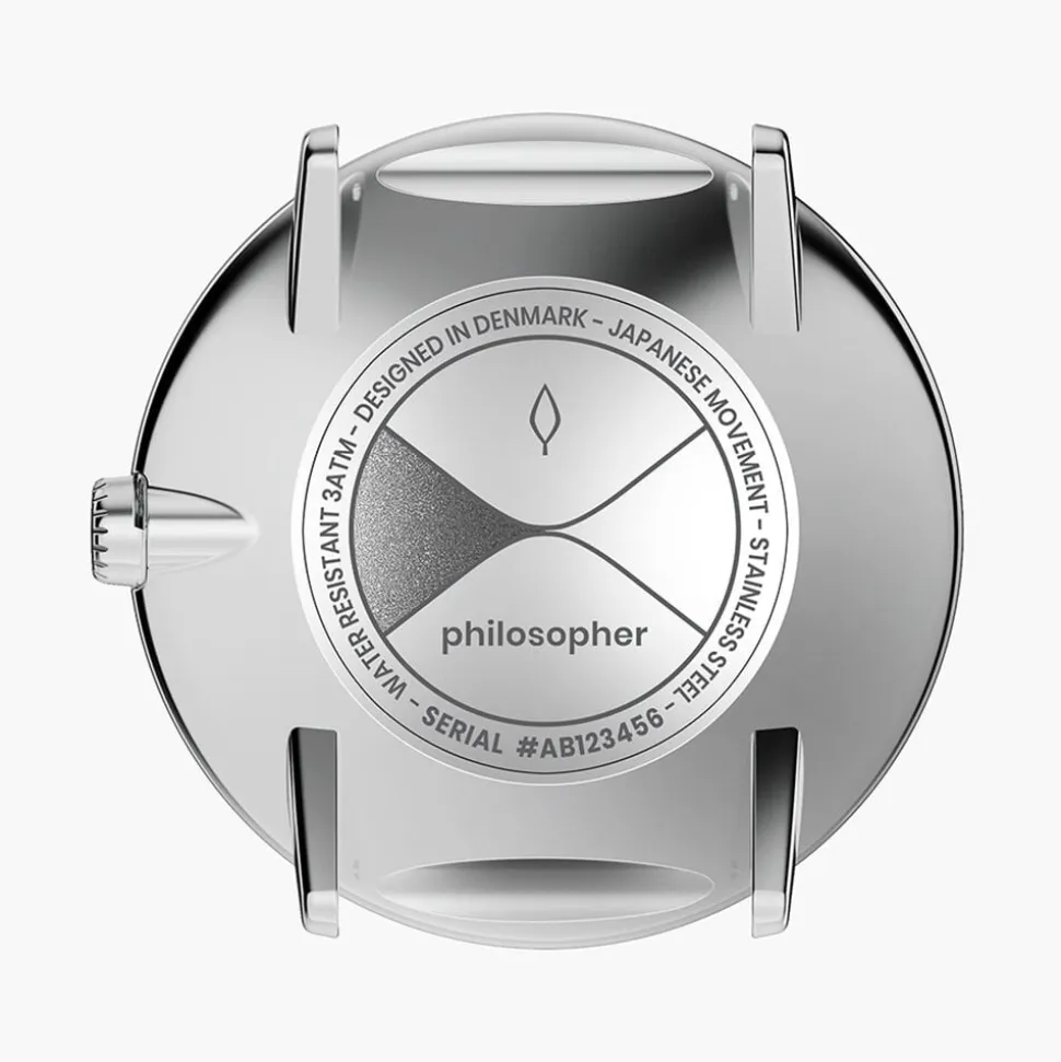 Philosopher, designet af Jakob Wagner, kombinerer subtilitet med styrke og udstråler minimalistisk elegance. De rene linjer, præcise detaljer og den asymmetriske sekundviser inviterer til nærvær i hvert øjeblik. Hævet på en konisk urkasse udstråler det tidløse design balance, selvsikkerhed og tilstedeværelse.
