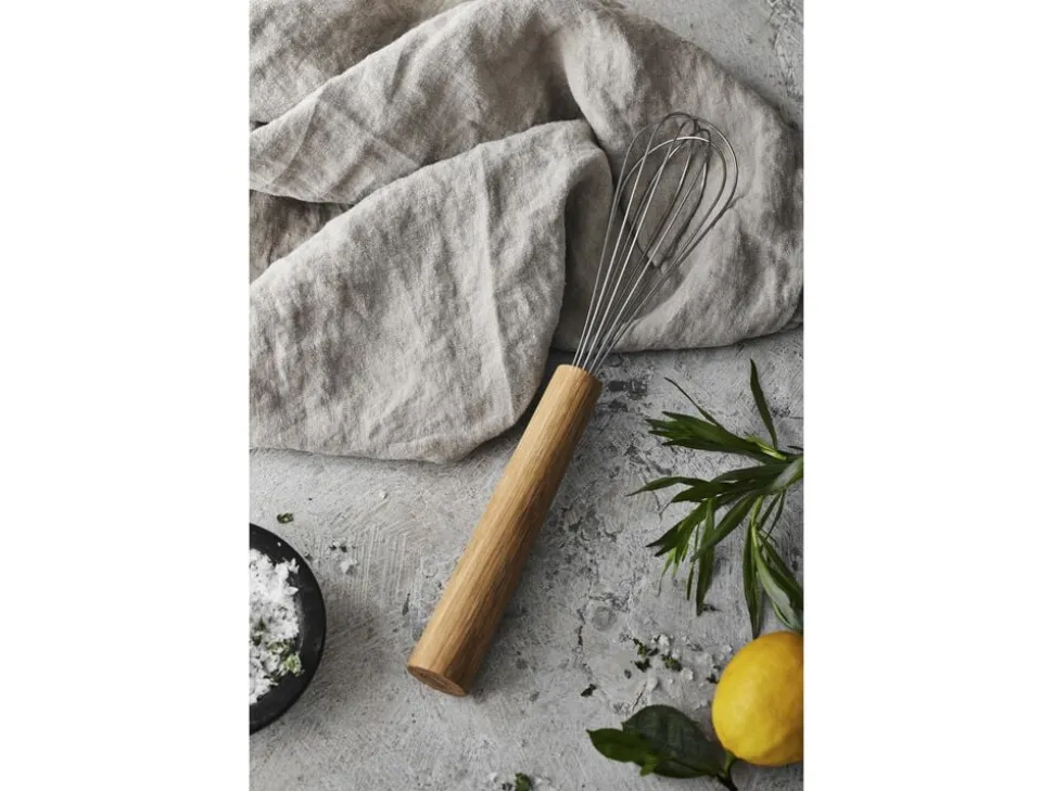 Piskeris 30,5 x 5,5 x 5,5 cm i rustfrit stål og smukt, olieret egetræ. Træredskaber er behagelige at arbejde med og skånsomme mod gryder og pander. De har en levende struktur og en varm glød, der passer ind i ethvert køkken. Varen er produceret i FSC®-certificeret egetræ (FSC-C166612). Douron det naturlige valgSerien består af funktionelle køkkenprodukter, hvor det gennemgående materiale er olieret eg. Serien har et enkelt og varmt udtryk, og med træets naturlige struktur får hvert produkt sit helt eget særpræg. Giv træet en god startTræ er et levende materiale, som naturligt ændrer sig over tid. Nogle holder af den varme patina, der langsomt udvikler sig, mens andre ønsker at bevare det oprindelige udtryk det kan bevares med den rette pleje og vedligeholdelse. Før du tager produktet i brug, anbefales det at mætte træet med en smagsneutral madolie fx vindruekerneolie. Træet skal være helt tørt, før du går i gang. Gnid olien ind med en ren klud, lad det trænge ind i mindst 6 timer, og tør derefter overskydende olie af. Vent 24 timer, før du begynder at bruge produktet. Gode råd til daglig brugTræ tåler ikke opvaskemaskine den høje varme og fugt kan få det til at revne. Vask produktet op i hånden med mild sæbe lige efter brug, tør det af med et viskestykke og lad det lufttørre helt, før du lægger det væk. Skulle træet rejse sig eller få små ridser, kan det let slibes med fint sandpapir, når det er helt tørt. Tør efter med en hårdt opvredet klud, lad det tørre og afslut med en ny omgang olie.