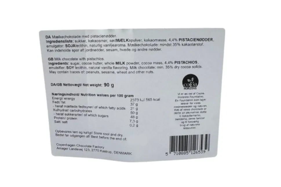 Mælkechokolade fra Magasin Chokolade toppet med knasende pistacienødder
