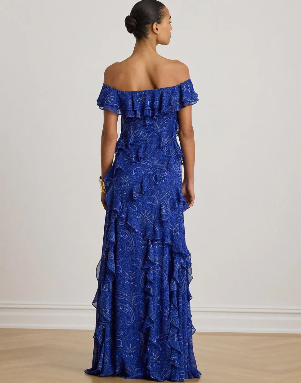 Kaskadede flæser og rynket georgette giver ubesværet bevægelse til denne fantastiske off-the-shoulder-kjole, som skildrer sæsonens tonale sjalsmønster.