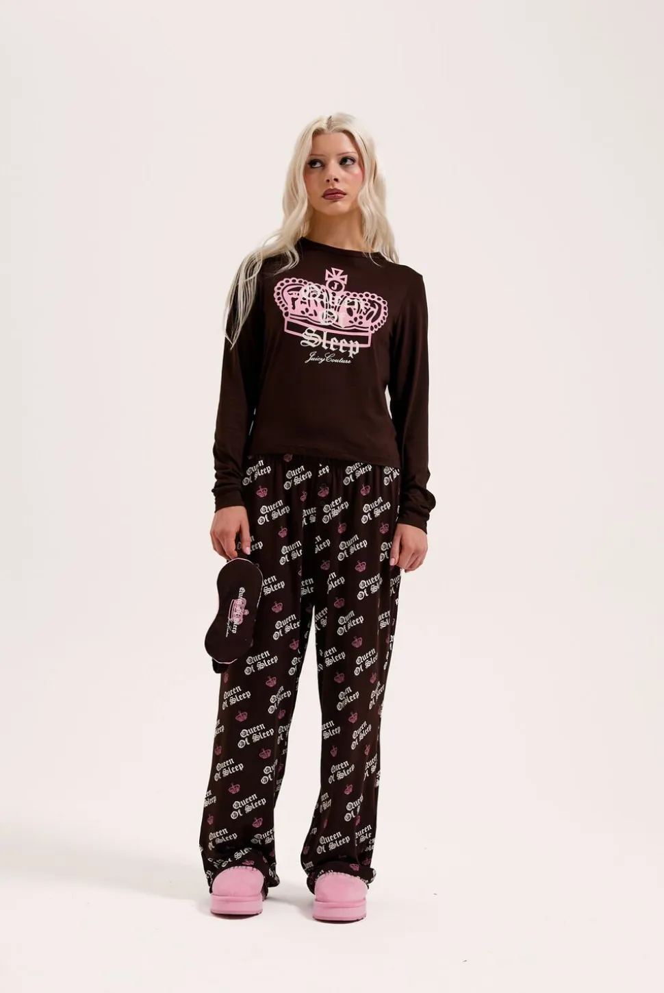 Peached jersey pyjamassæt med øjenmaske. Pyjamasbukser med fuldt slogantryk + langærmet topsæt med Queen of Sleep-branding