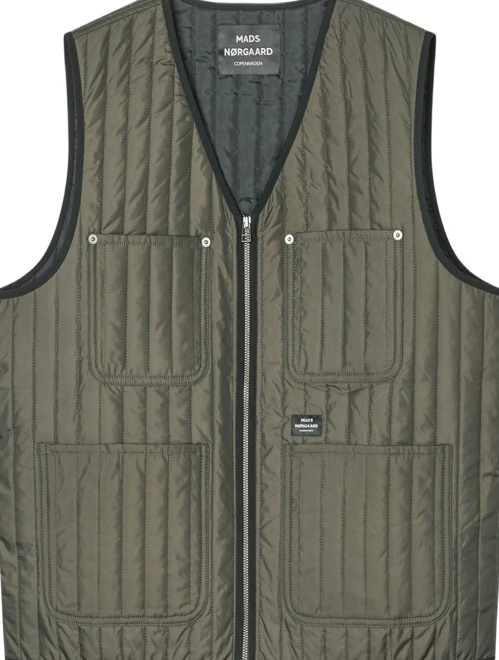 Glat termovest med lynlås, V-udskæring og fire udvendige lommer.