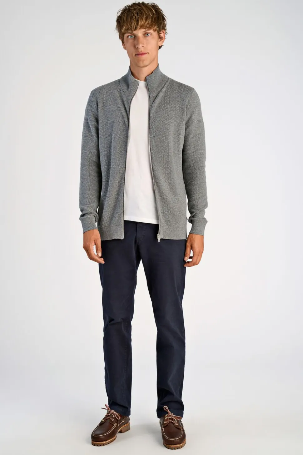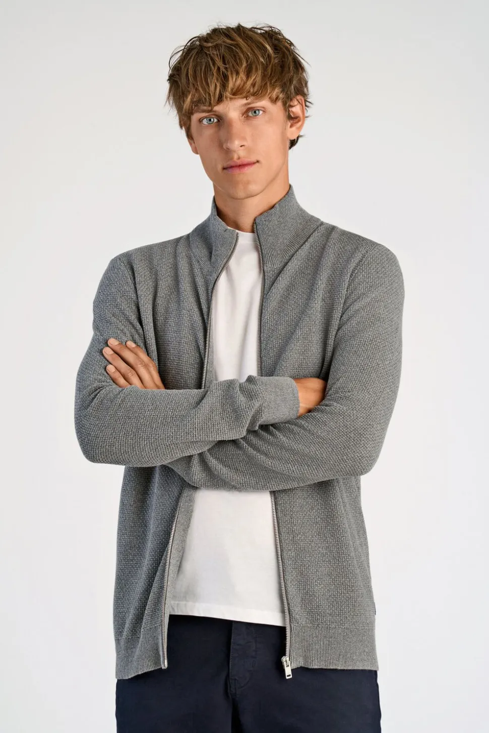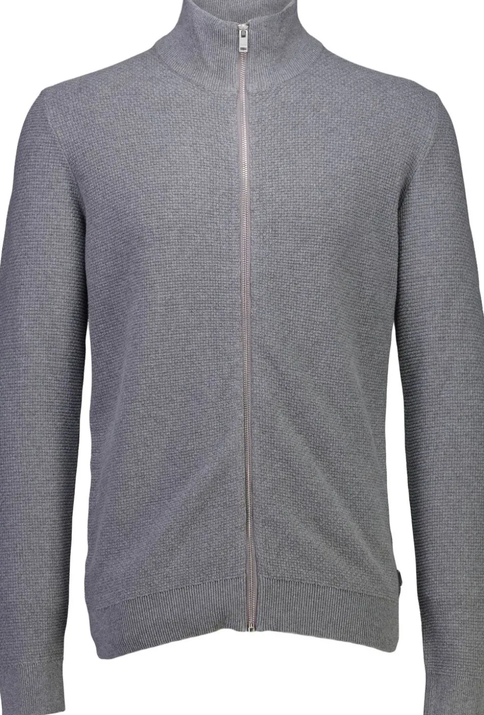 Strikket cardigan fra Lindbergh lavet i 60% genanvendt bomuld og 40% genanvendt polyester. Trøjen er ensfarvet og har ribkanter nederst på ærmerne og nederst på selve trøjen samt et logomærke nederst på venstre side.
