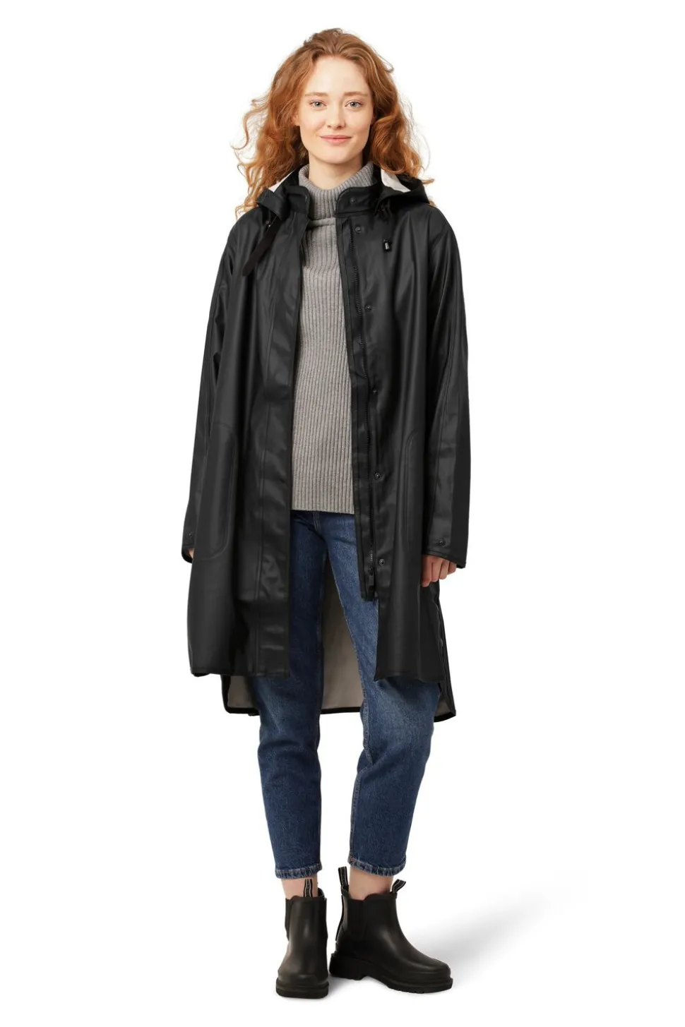 A feminine A-shaped raincoat in loose fit. The raincoat has a discreet Ilse Jacobsen Hornbæk logo debossed on left sleeve. The hood is detachable and is attached by a weather proof strap in artificial leather. The style features side seam pockets, side seam slits and a YKK 2-way zip closure at center front. Quality is a light and subtle waterproof rubberized PU with polyester tricot on backside and all seams are double welded. The style is available in a wide range of both classic and seasonal colours.