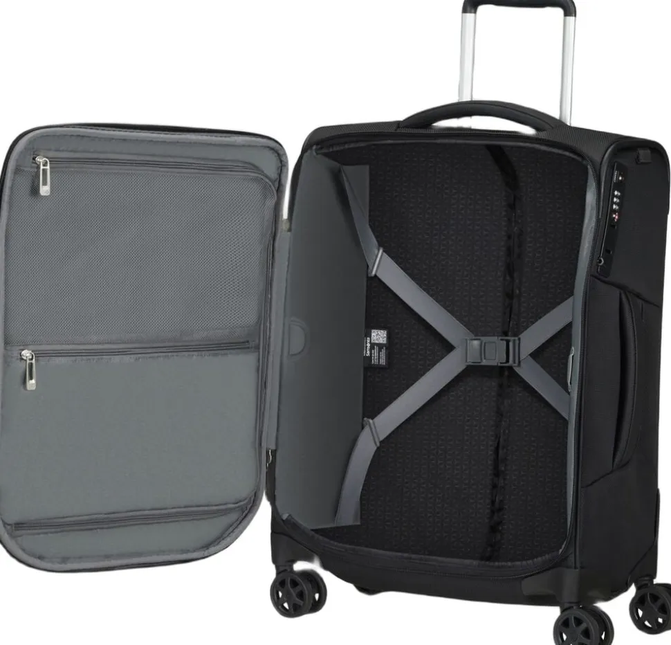 Kabinekuffert hvor både et indvendige og udvendige stor er lavet af genbrugte plastflasker, 4 dobbelte hjul, TSA lås , dobbelt trollystativ, navneskilt, låsbar frontlomme, vægt 2,4 kg,rumindhold 43 l, 5 års garanti,55x40x20 cm.