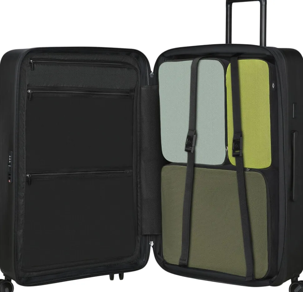 Kuffert med mulighed for udvidelse,indeholder 3 pakkeposer, mulighede for personalisering med de medfølgende stickers, polypropylen,4 hjul,TSA lås , indvendig stofforring lavet af genbrugte plastflasker, dobbelt trollystativ,navneskilt, vægt 3,9 kg,rumindhold 99/109 l, 5 års garanti,75x51x29/32 cm.