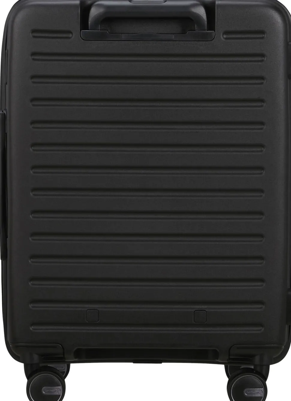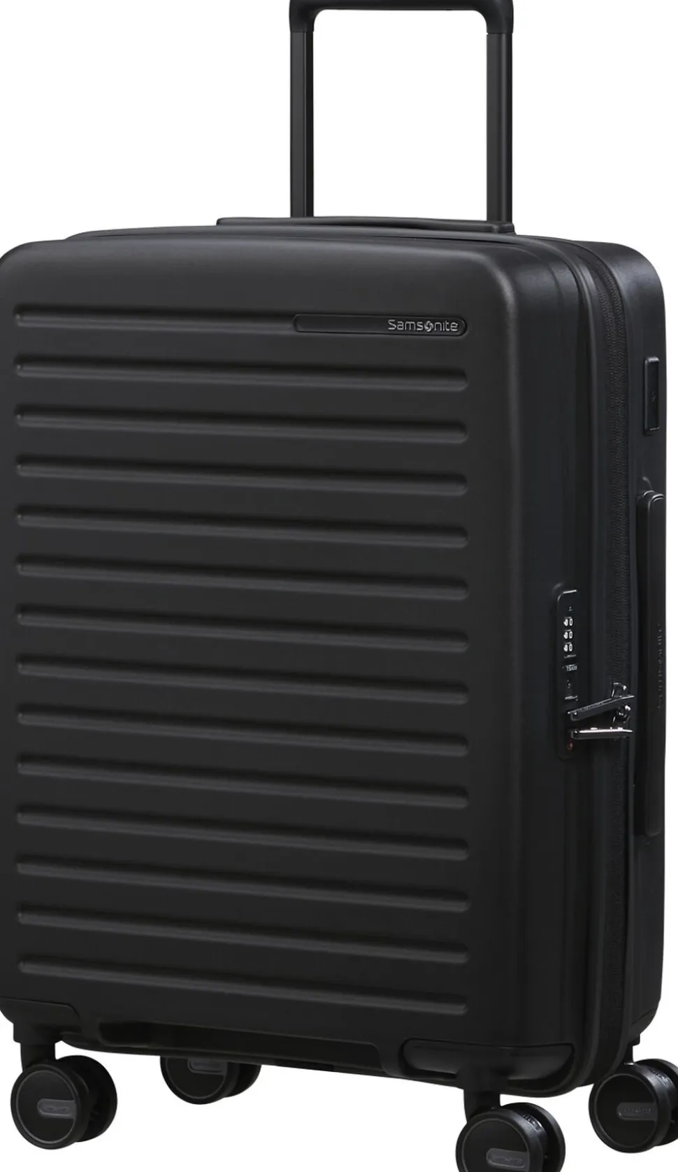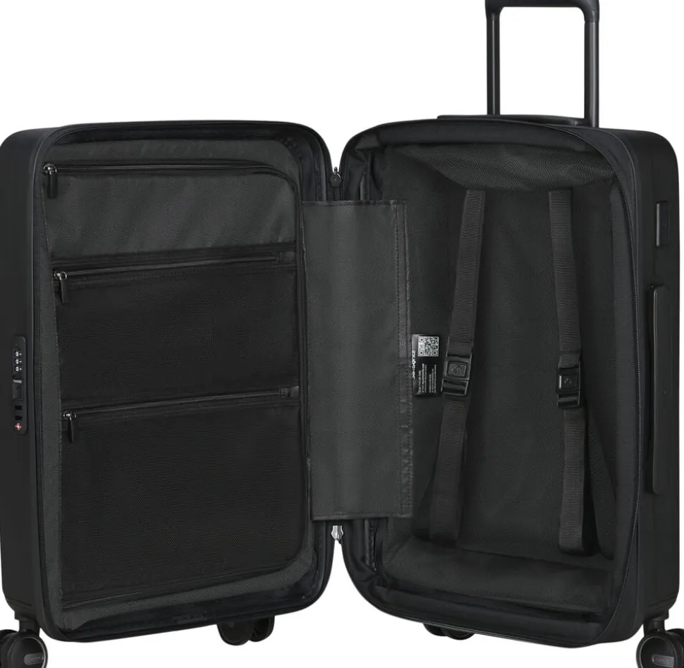 Kabinekuffert med mulighed for udvidelse, polypropylen,4 hjul,TSA lås , indvendig stofforring lavet af genbrugte plastflasker, indeholder 2 pakkeposer, mulighed for personalisering med de medfølgende stickers, dobbelt trollystativ, navneskilt, vægt 2,7 kg,rumindhold 39/45 l, 5 års garanti,55x40x20/23 cm.