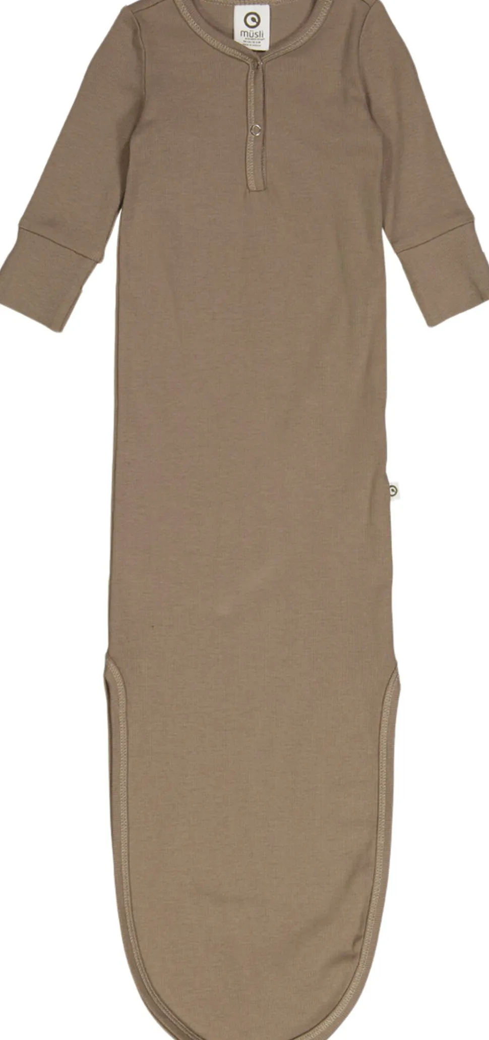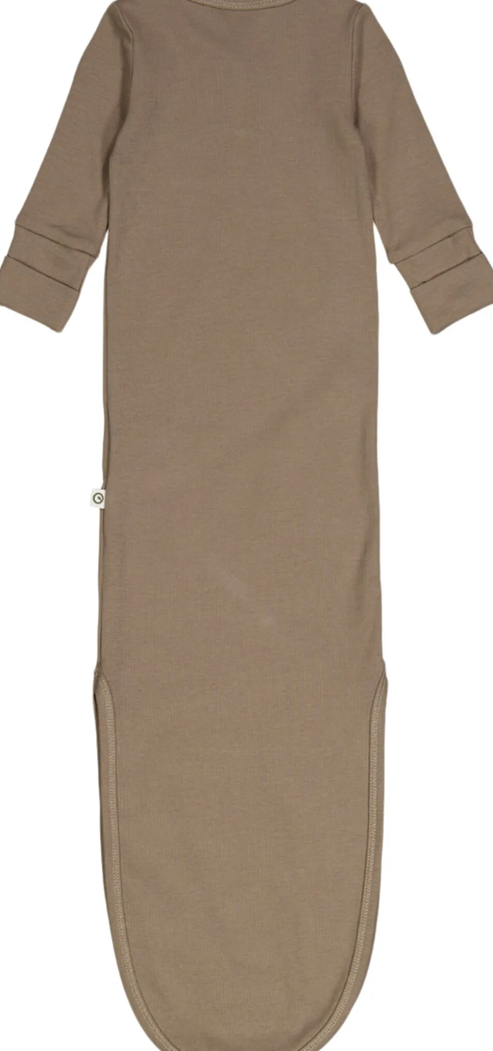 Skøn og blød ribbet soveposedragt med knude lukning i bunden Knuden ved den lilles fødder gør det nemt med hyppige bleskift. Specielt smart om natten hvor man ikke vil vække baby mere end højest nødvendigt. Der er ydermere vendbare hænder, så man kan holde babys hænder inde i dragten. Brug den til at give ekstra tryghed, som sovepose en varm sommerdag, eller hvor den passer ind for jer. Den tilpasser sig barnet, og giver en omsvøbende effekt. Ribstrikken giver en dejlig elastisk fornemmelse, der smyger sig om baby og holder formen. Fremstillet i bomulds-rib med elastan for bedst mulig pasform og komfort. (GOTS Organic Certified by Ecocert Greenlife Lic. No. 152033). Produktet er GOTS organic- certificeret, hvilket betyder at bomulden er certificeret økologisk, og at der i alle andre processer som farvning, strikning og syning er taget de strengeste hensyn til miljøet. GOTS er internationalt anerkendt som den førende standard for forarbejdning af tekstiler af økologisk bomuld. Derudover tages der også hensyn til arbejdsforholdene, hos dem der producerer tøjet. Økologisk bomuld 95%, Elastan 5%