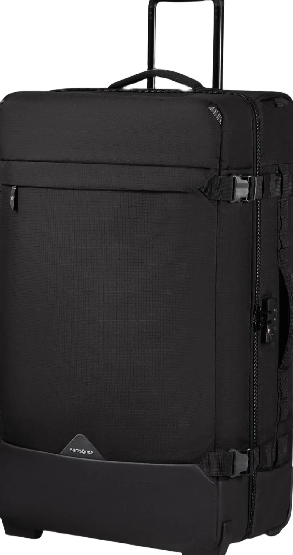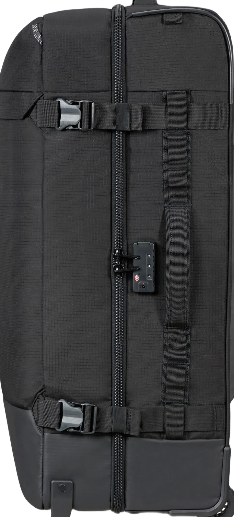 Rejsetaske med hjul, både det indvendige og udvendige stof er lavet af genbrugsplast, frontlomme med lynlås, TSA lås, indvendig krydsbånd og skillerum med lynlås, rumindhold 116 l, vægt 3,2 kg. 5 års garanti.