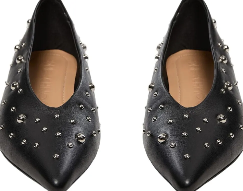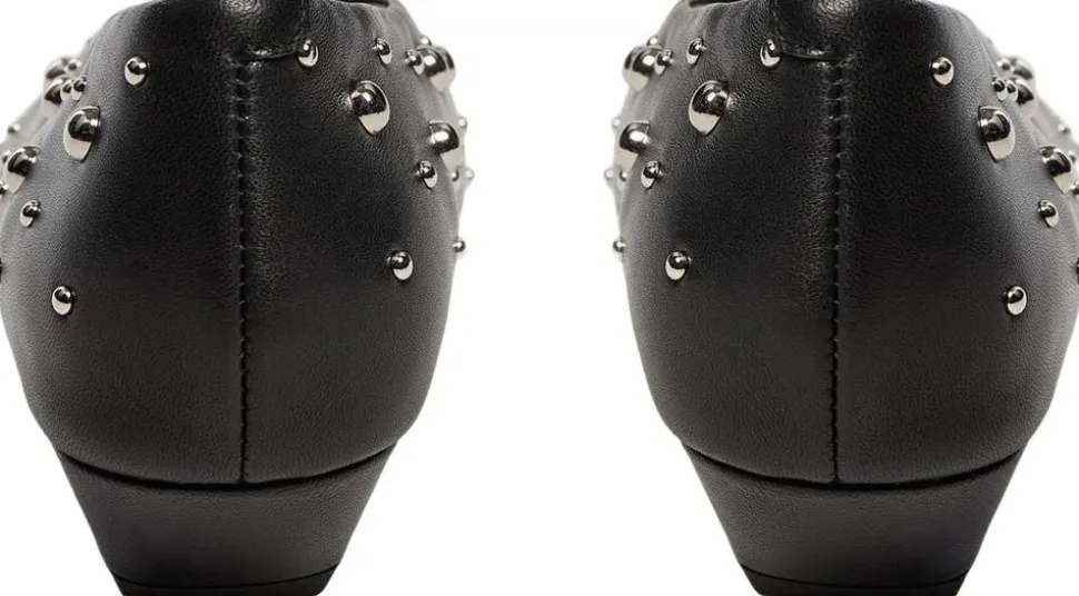 • Sort ballerinalæder • Sølvfarvede nitter i forskellige størrelser • Spids tå • Lav konisk hæl • 100 % læder, 100 % gummisål