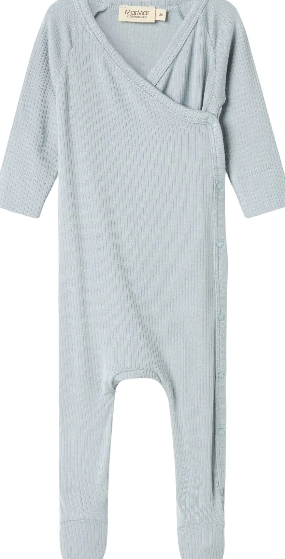 Langærmet baby modal bodystocking med stolpe knaplukning, der bliver lukket med trykknapper mellem benene for nem bleskiftning. Bodystockingen er både ribstrikket, blød, holder form og farve og har elastan i sig som gør den strækbar og behagelig at have på.