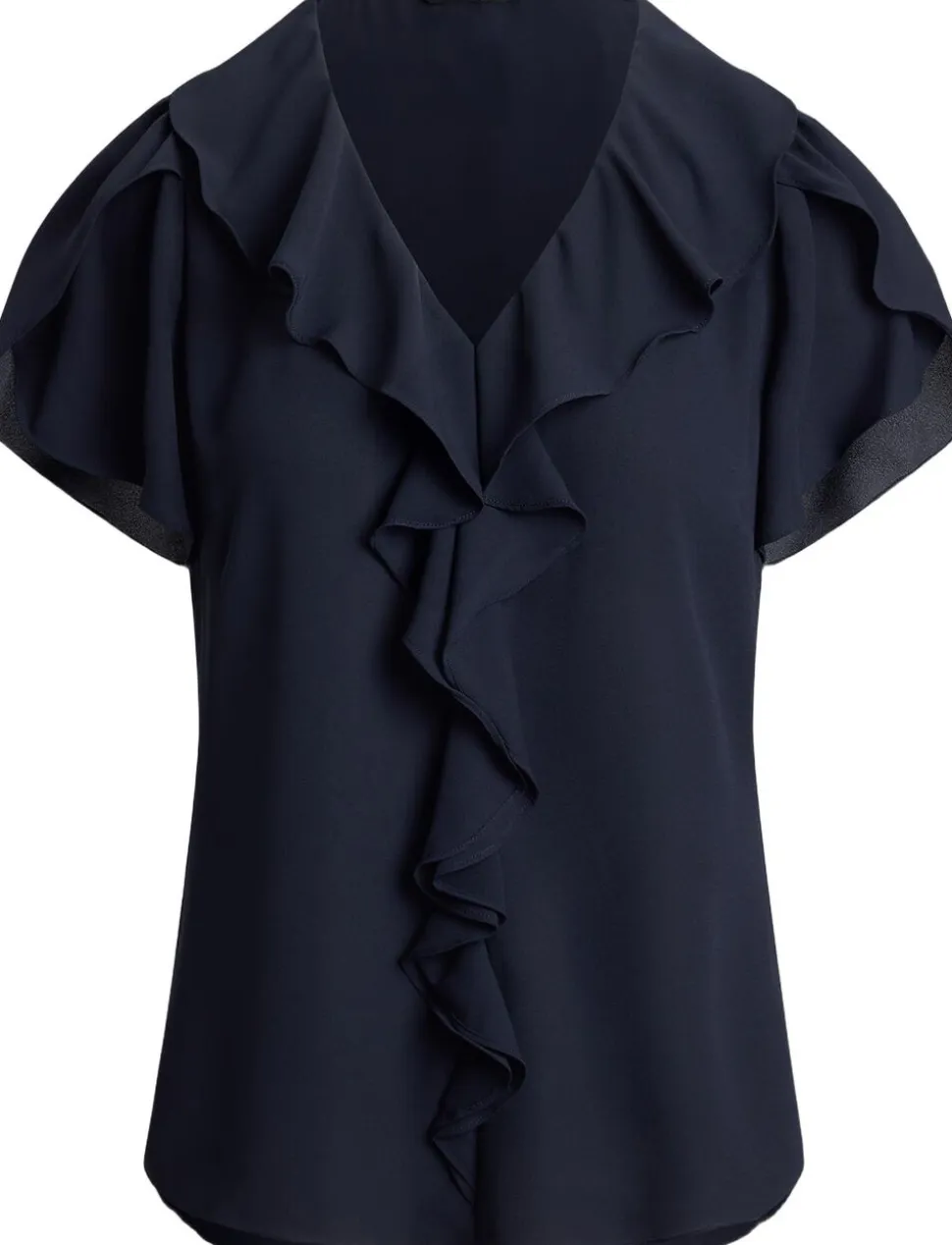 Denne bluse er ubestrideligt romantisk og forener luftig georgette med flæsekant og flagrende tulipanærmer