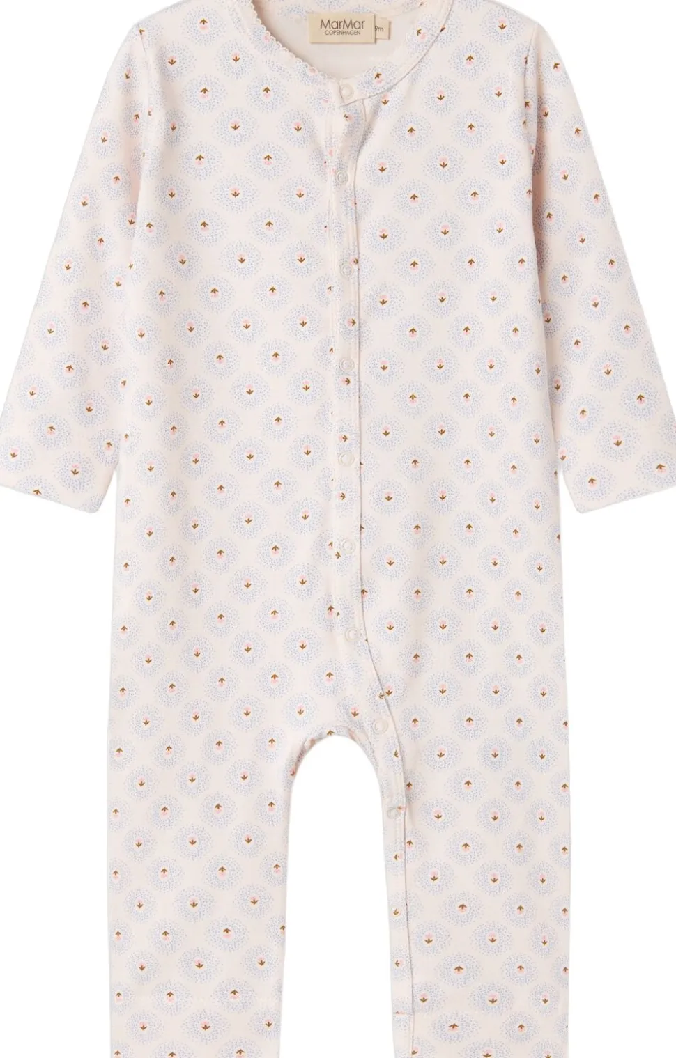 Langærmet baby modal bodystocking med stolpe knaplukning, der bliver lukket med trykknapper mellem benene for nem bleskiftning. Bodystockingen er både ribstrikket, blød, holder form og farve og har elastan i sig som gør den strækbar og behagelig at have på.