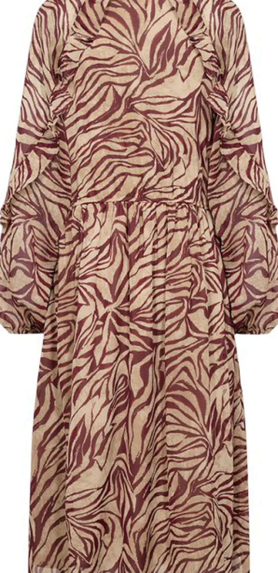 SC-VALBORG 2 Dress er fremstillet af 100 % genbrugspolyester. Den har V-udskæring, lange ærmer med rynkede manchetter og en afslappet, halvlang pasform med et dristigt, abstrakt print. Sæt den sammen med ankelstøvler og en crossbody-taske for et stilfuldt look.