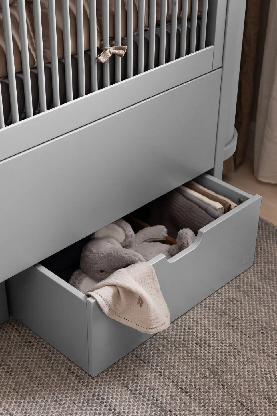 Før barnet begynder at vise tegn på at kunne trille eller sætte sig op, skal sengebunden sænkes til nederste position. Den sænkede sengebund og de karakteristiske tremmesider sørger for en sikker seng til dit barn i de første leveår.