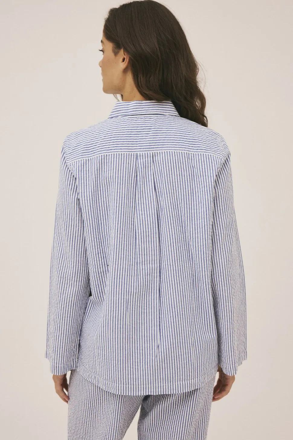 Skjorte fra Magasin du Nord Collection i den blødeste kvalitet af 100% økologisk bomuld med GOTS-certificering. Skjorten har det fineste, stribede print, lange ærmer, knaplukning, frontlommer, slidser i siden samt en vid pasform. En skøn skjorte i den lækreste kvalitet.