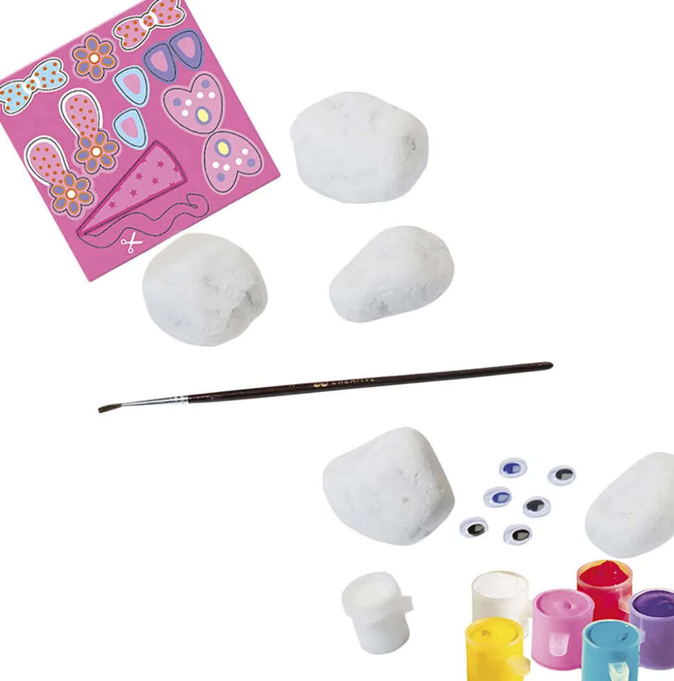 Indhold: 5 sten og 8 øjne med bevægelse i forskellige størrelser,Maling med 6 farver, malerpensel og lim samt tilbehør i karton.
