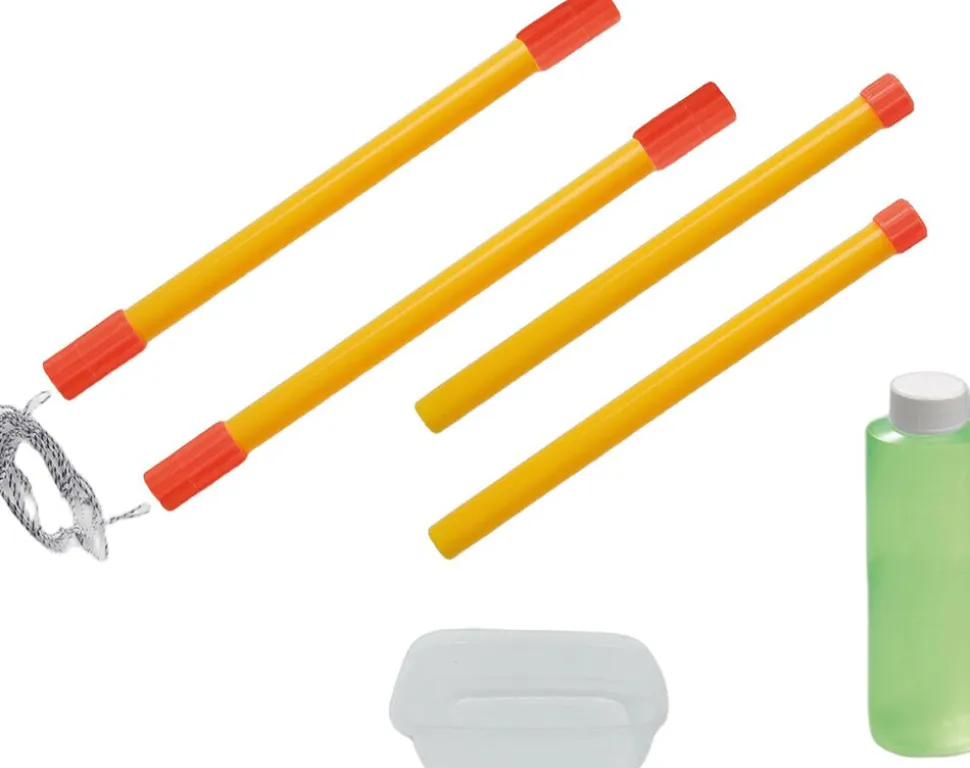 Inklusiv to 53 cm lange stænger med reb, en blandebakke og en 200 ml flaske sæbeopløsning. Hold blot stængerne sammen, dyp rebet i sæben. Løft stængerne op igen og træk dem forsigtigt fra hinanden.