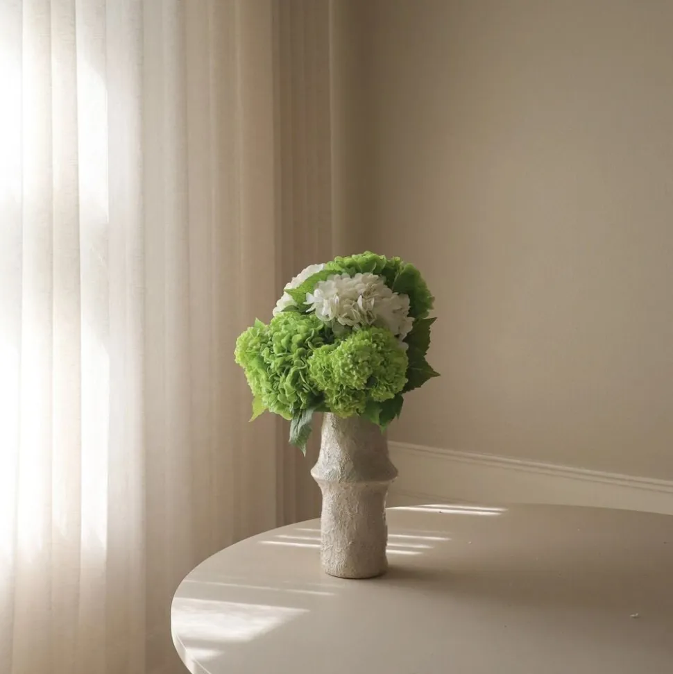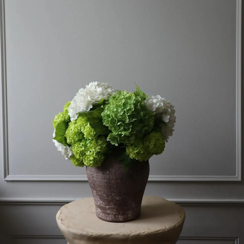 Denne buket præsenterer en harmonisk blanding af helt hvide og frodigt grønne hortensiaer, arrangeret for at fremhæve deres fyldige, runde blomster. Kombinationen af større hortensiablomster og fine mini-snebolde skaber en lagdelt og tekstureret komposition. Buketten mler op til 49 cm i højden, men alle stilke kan let bøjes og justeres for at opn den ønskede højde og form til enhver opsætning.