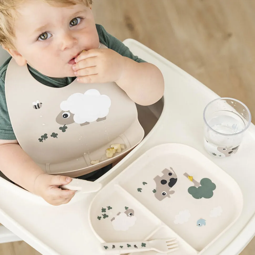 Hagesmækken har en lomme til at fange tabt mad