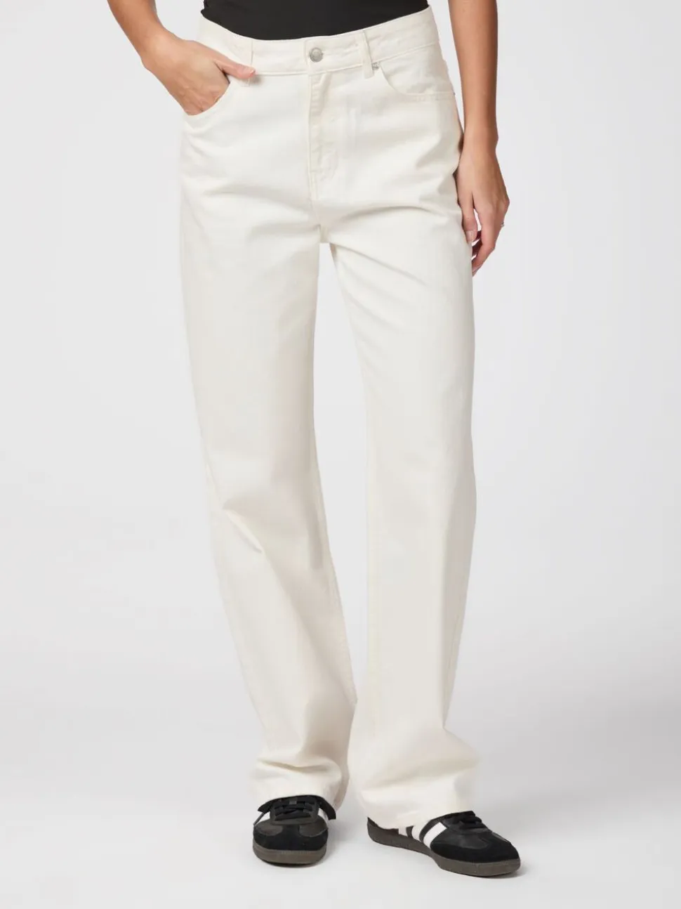 Jeans med mellem-høj talje og lige ben. De har bæltestropper i taljen, klassiske 5-pockets og lukkes med en knap samt skjult lynlås. Jeansene har et loose fit og er lavet i en ikke-strækbar bomuldskvalitet. Modellen er iført størrelse 36.