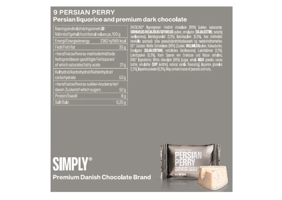 PERSIAN PERRY Cube m/ 9 bites. Premium hvid chokolade med ægte persisk lakrids. En anelse mere bitterhed end i den gængse lakrids gør denne kombination af sødt og bittert perfekt! Simply Chocolate barer er lavet på det bedste naturen har at tilbyde. Premium kvalitetschokolade helt fri for kunstige tilsætningsstoffer.