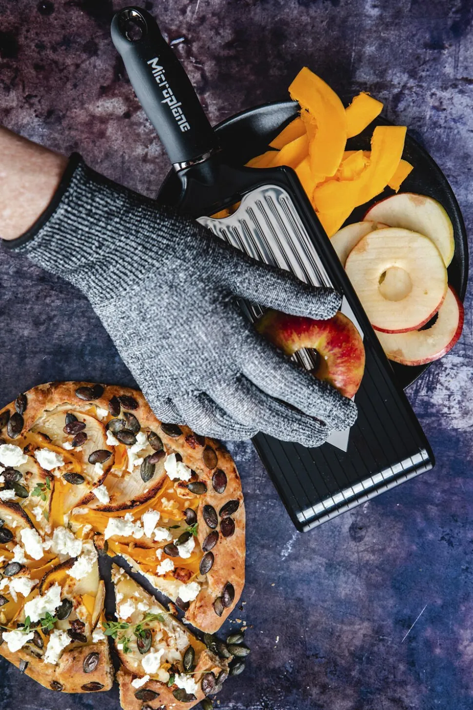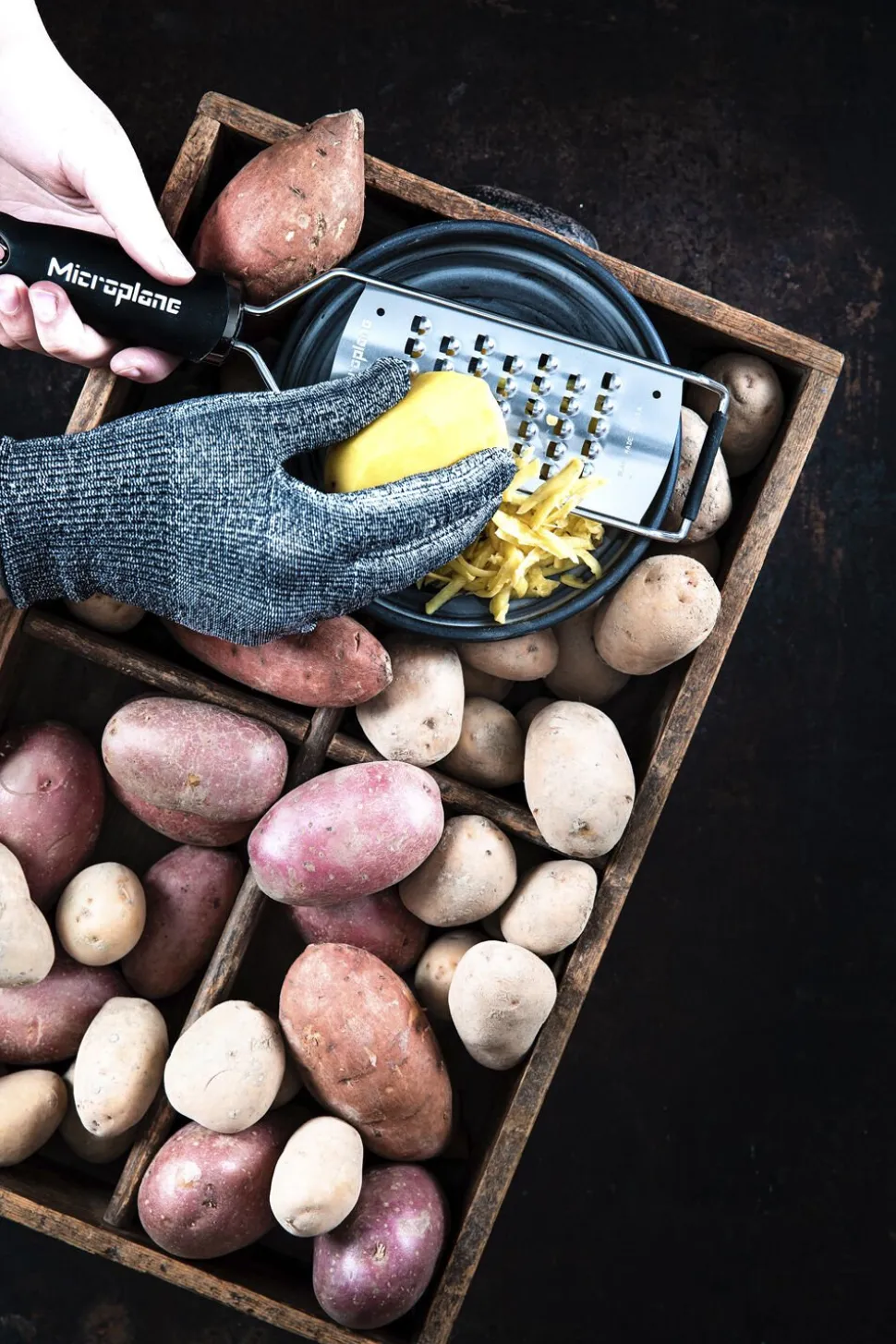 Den er udviklet specielt til at beskytte hænderne mod Microplanes skarpe skær. Handsken er både velegnet til højre- og venstrehåndede og kan vaskes i både opvaske- og vaskemaskinen.