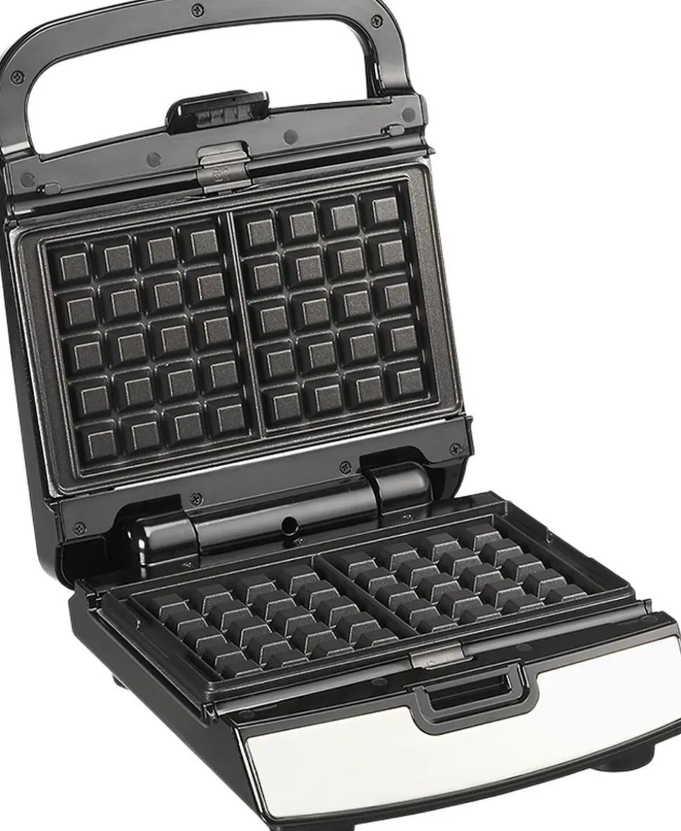 Multifunktion sandwich & vaffelmaskine, som leveres med 2 bokssæt.