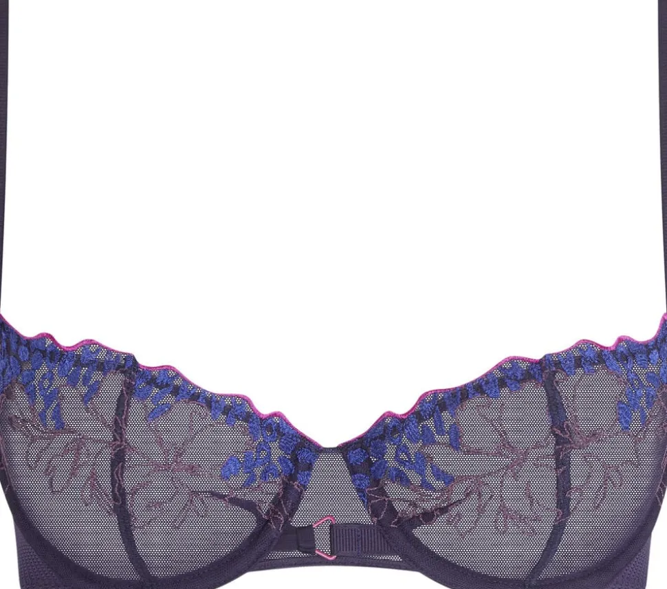 Spice fra Chantelles nye Pulp-koncept. Spice kombinerer neonfarver med natur-og blomstermotiver. Half cup BH med broderi på skålen. B-G skål.