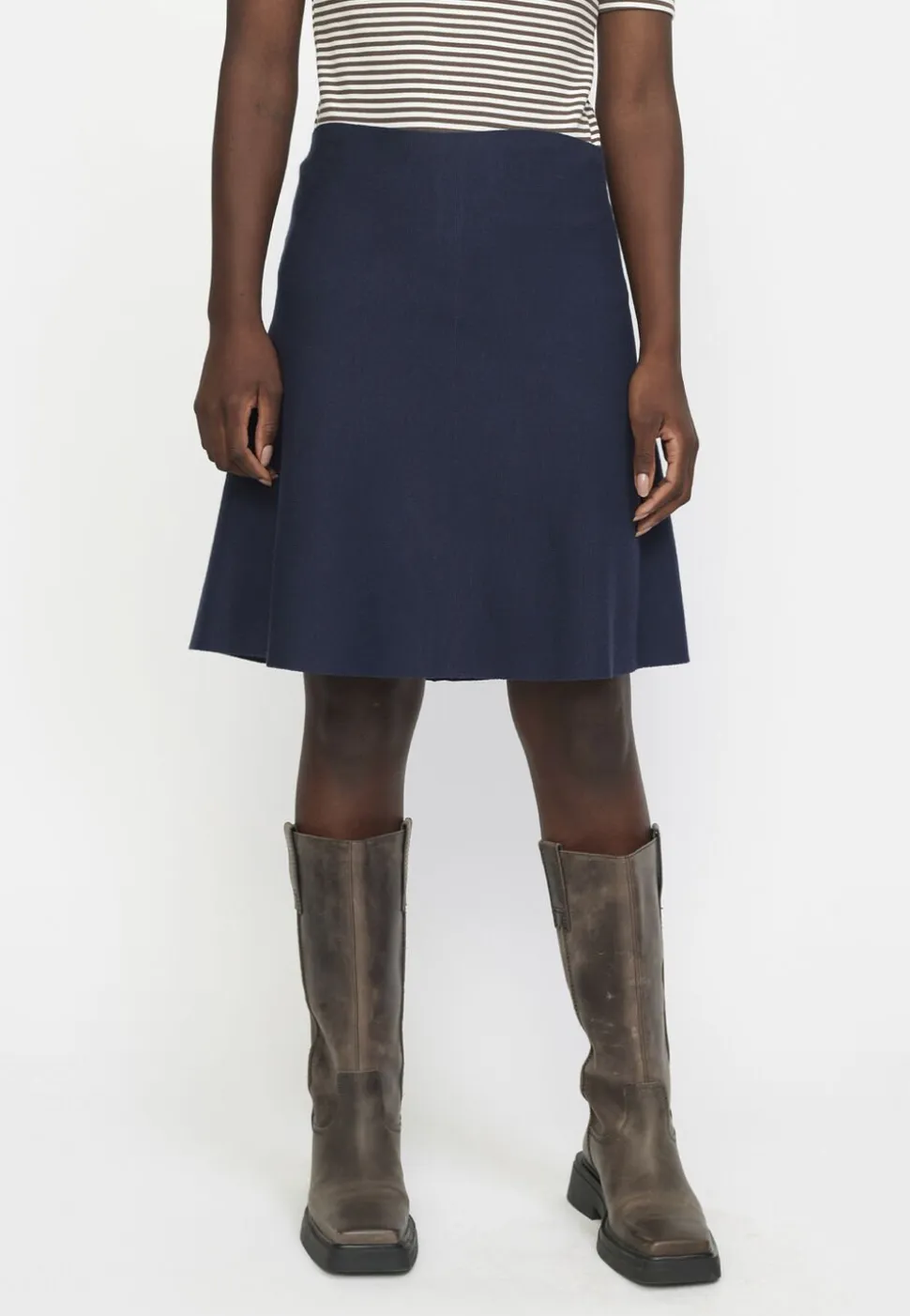 Klassisk sort nederdel til de fleste lejligheder. Med elastik i taljen og behageligt stof. Sød og enkel nederdel, der er uundværlig i garderoben på grund af sin alsidighed. Let at style med en bluse eller blazer. Længden bagpå er 49 cm i størrelse S. Modellen er iført str. S. – Strikket – Elastiktalje. LENZING® og ECOVERO® er varemærker tilhørende Lenzing AG