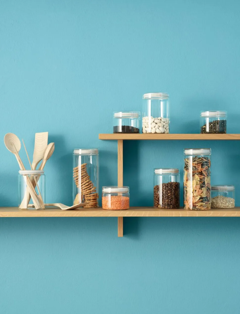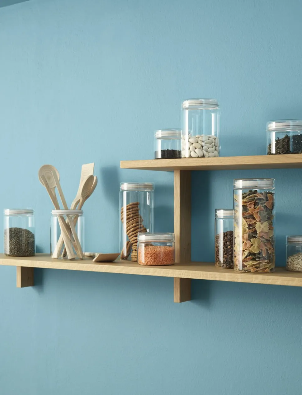 STORE-IT opbevaringsglassene er som skabt til opbevaring af fx gryn, pasta og korn i køkkenet. Det minimalistiske, cylindriske design optager ikke meget plads i skuffe, skab eller på hylden, og det gennemsigtige glas, gør det let og hurtigt at afkode indholdet af glasset. Silikoneringen sikrer, at låget slutter tæt, så indholdet ikke afgiver lugt eller optager smag fra andre madvarer. Glassene kan også bruges i køleskabet til opbevaring af marmelade, chutney eller madrester.