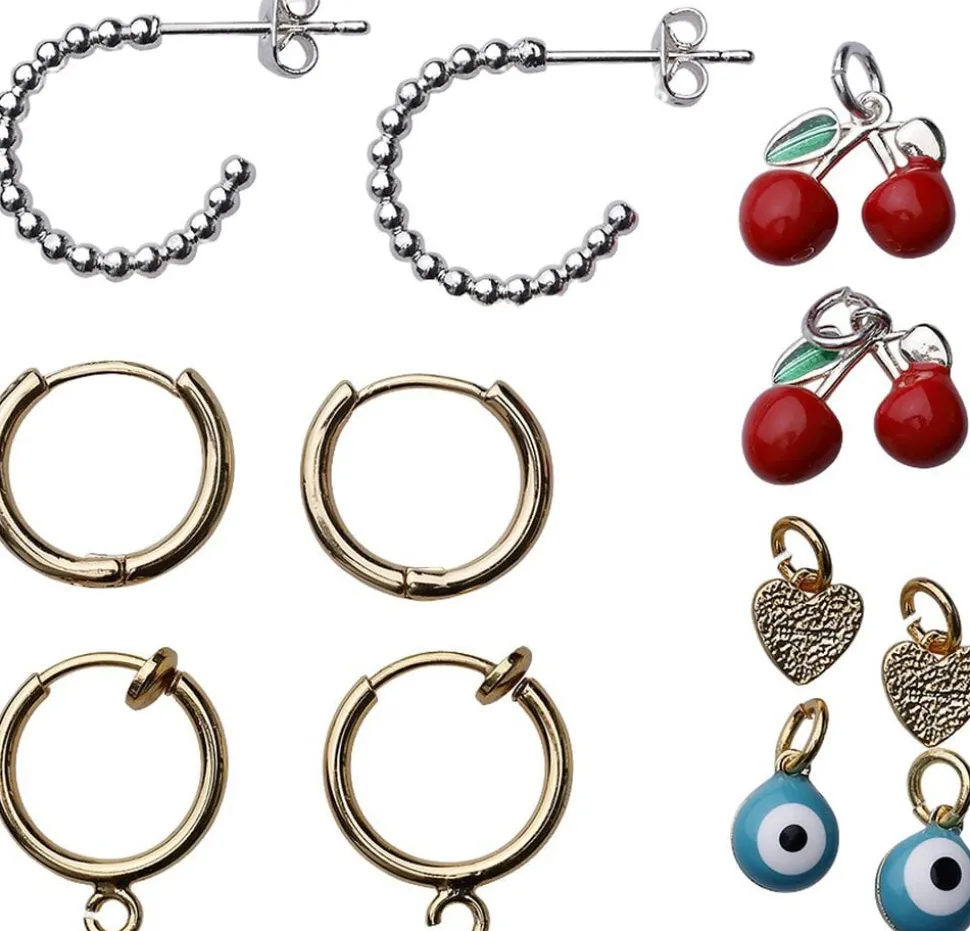 Lav 3 par virkelige fine øreringe. Du skal blot vælge vælge vedhæng, du ønsker der skal hægtes på. Du kan også bruge dem uden. Metallerne er testet nikkel- og blyrfri.