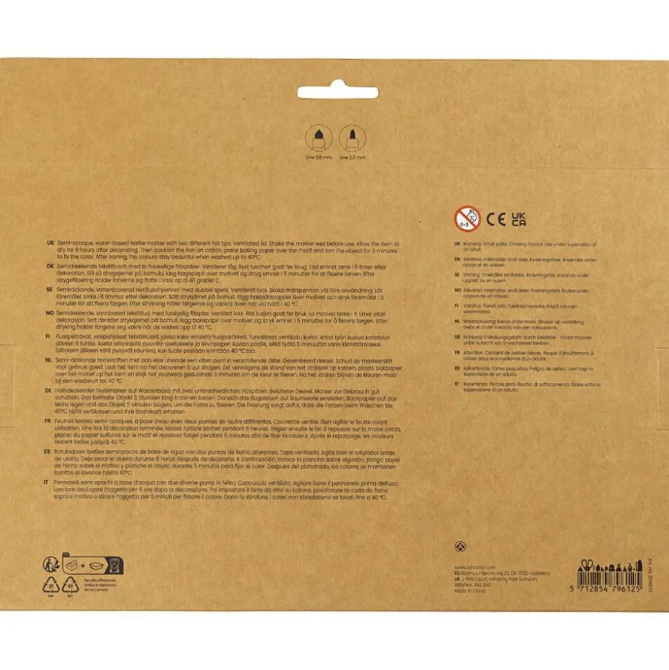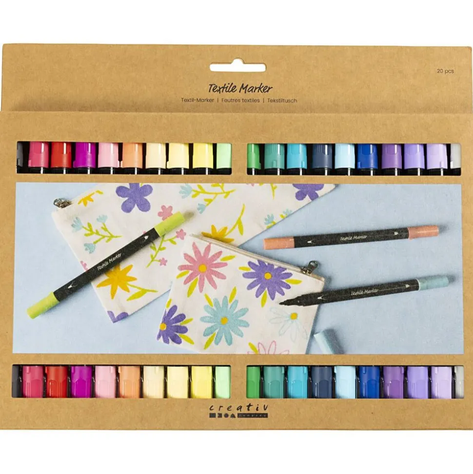 Semidækkende tekstiltuscher med to forskellige filtspidser i hver, som du kan bruge til at dekorere nye og gamle tekstiler med. Tekstiltuscher er gode til kreative genistreger. Med dem kan du bringe alverdens stof til live med unikke mønstre og søde tegninger – og du kan samtidig gå farve-amok! Tusserne er derfor et sikkert hit i alle aldre, både hos tegnglade voksne og kreative børn. Har du brug for en tynd streg til at tegne og skrive med – eller en tyk streg til at farvelægge med? Med vores tekstil markers får du begge muligheder. Så skal det være nemt at dekorere på tekstil og stof, er denne populære tusch et rigtig godt valg.. Ryst tuschen godt før brug, og læg plast eller pap ind i fx t-shirts og muleposer, så farven ikke smitter af på bagsiden. Når farven er tør, kan du strygefiksere med bagepapir over og under tekstilemnet. Efter strygefiksering holder farverne sig flotte i vask op til 40 grader C. Bemærk, at tuschen er perfekt til lyse tekstiler af bomuld m.m.