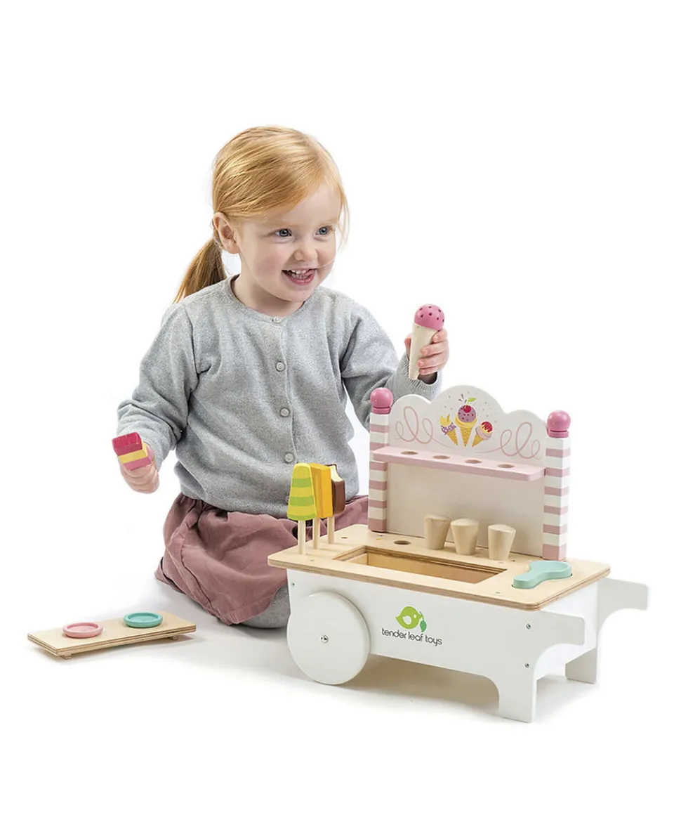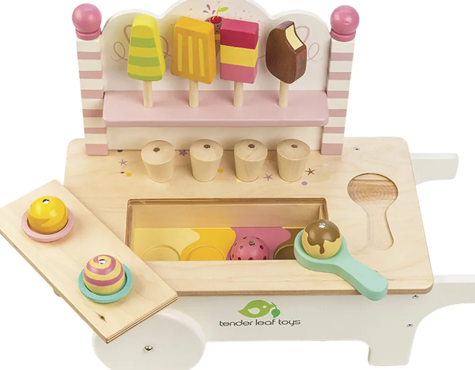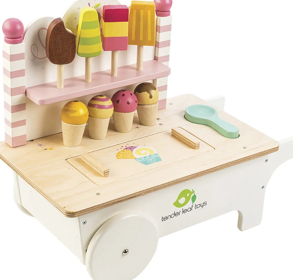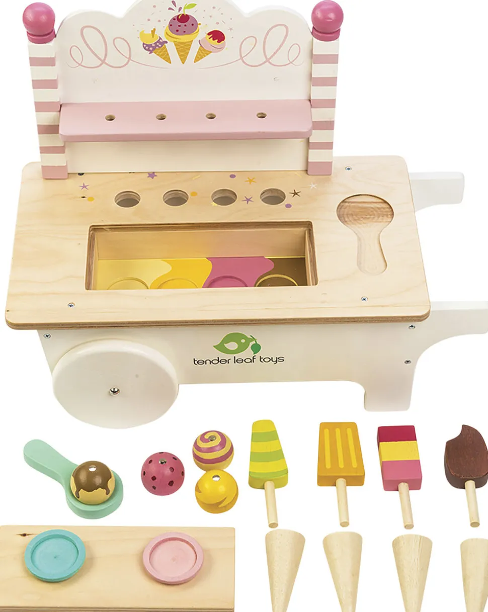 4 ispinde af træ, 4 kræmmerhuse, 4 farverige iskugler med magneter, en magnetisk isske og et aftageligt låg, hvorunder man kan opbevare alle isene.