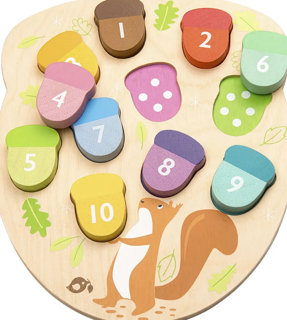 Sættet indeholder 10 farverige agern. Under hvert agern afsløres vises den matchende farve og et antal prikker svarende til tallet på forsiden.