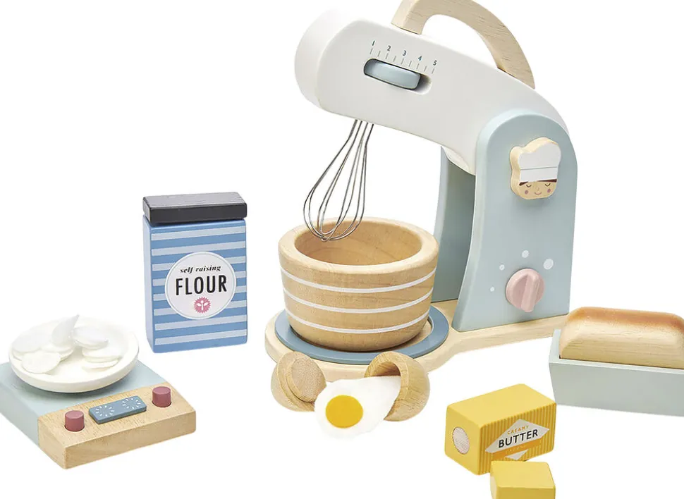 En stilfuld røremaskine/mixer med metalpiskeris der kan dreje, røreskål i træ samt tilbehør.