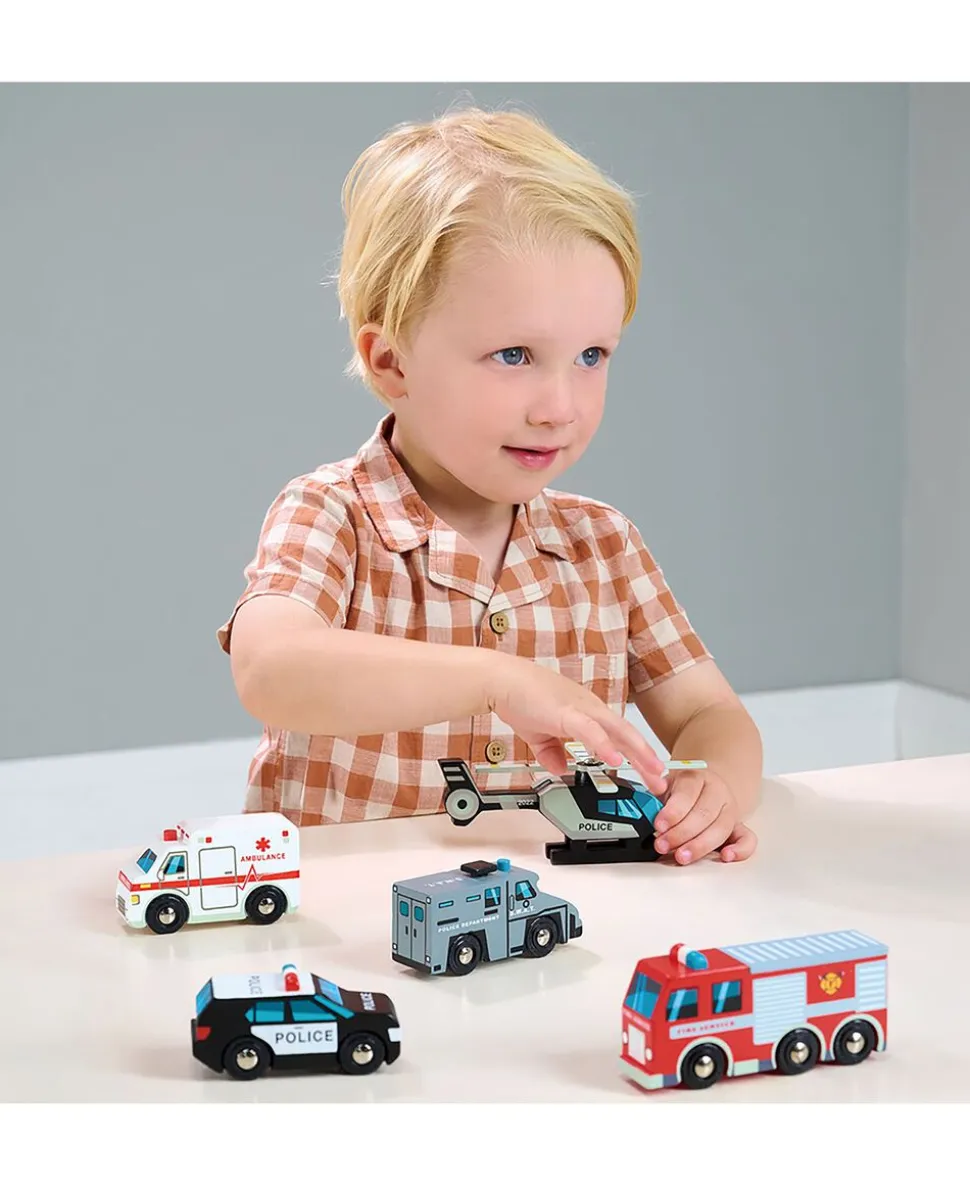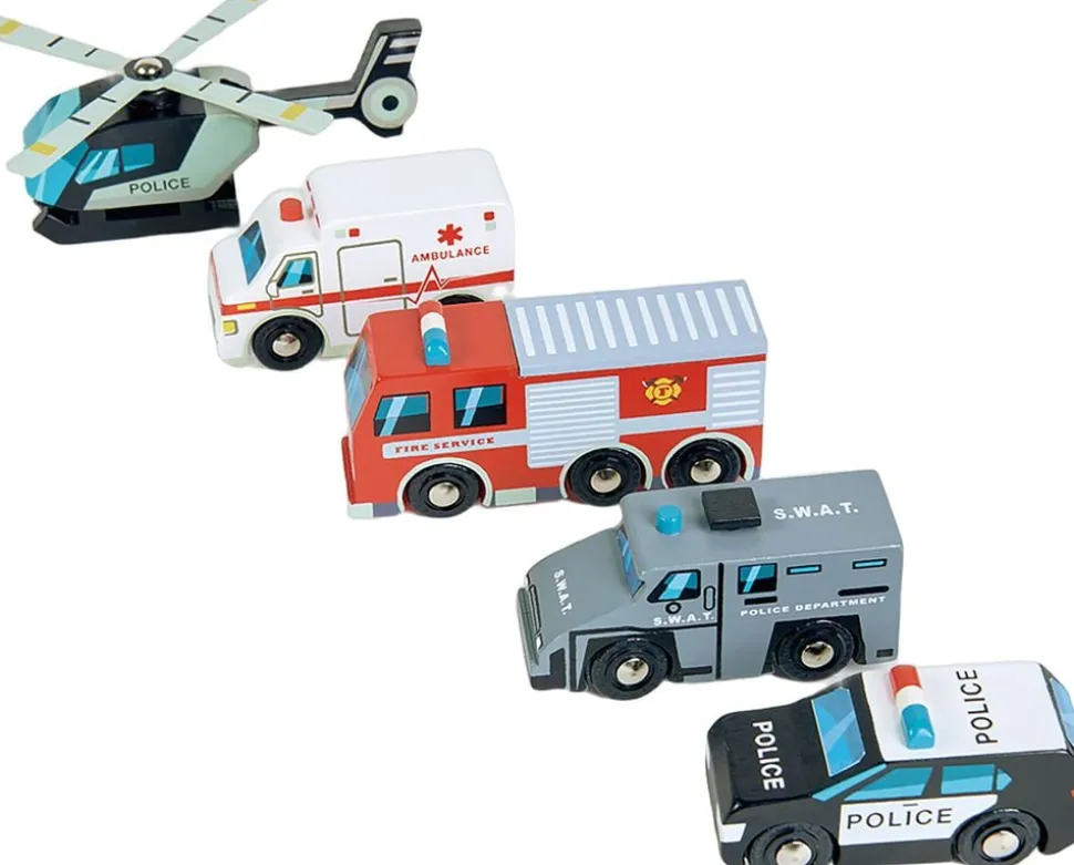 Indhold: Helikopter med roterende vinger, ambulance, brandbil, politibil og indsatsvogn.