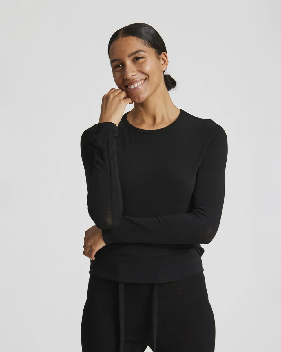 Thyra er en langærmet tee shirt, som er lavet i 28% uld, 67% viskose og 5% elastan. Tee shirten har rund halsudskæring og en tætsiddende pasform. Tee shirten er en anelse længere bagpå end foran.