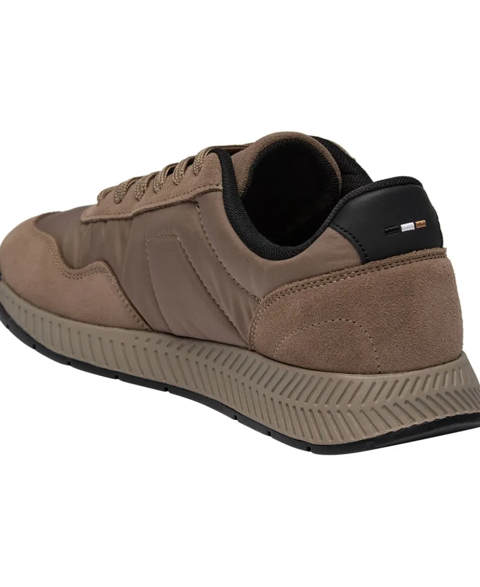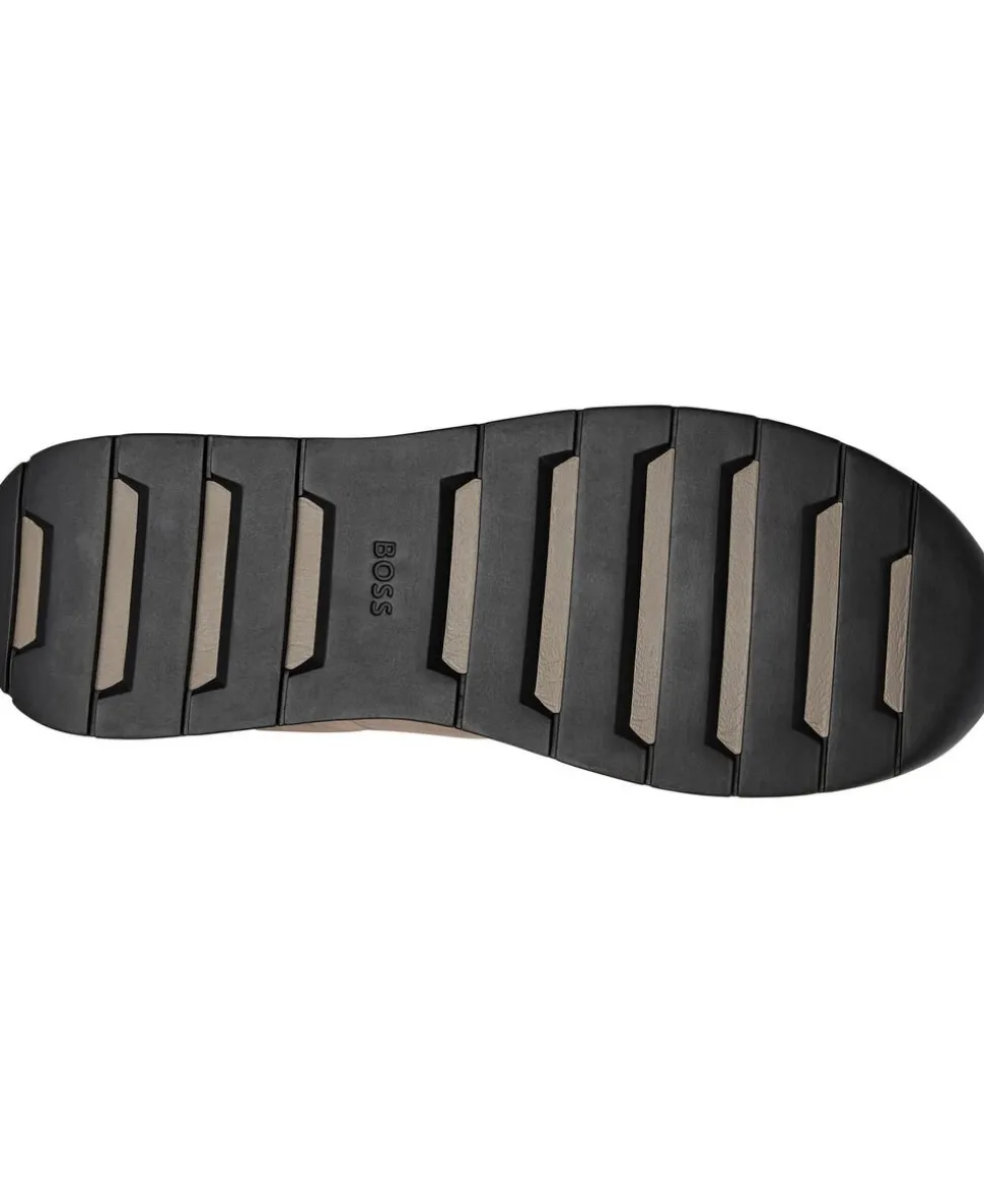 Disse sneakers fra BOSS Menswear har en polstret overdel i mat nylon med bløde ruskindsbelægninger, der giver et sporty look. Karakteristisk ribsål