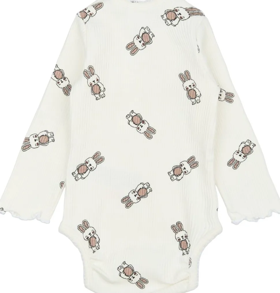 Langærmet ribstrikket bodystocking med et sødt mønster af smilende kaniner. Denne charmerende bodystocking fra THE NEW Siblings er perfekt til sæsonen og egner sig både til hverdag og særlige anledninger. Den har søde blonde-detaljer rundt ved åbningerne på bodystockingen. Sæt den sammen med de matchende TNSBPippa leggings for et sødt sæt. – Normal pasform – Langærmede – Rund halsudskæring – Ribstrik – Smilende kaniner AOP (all-over print) – Trykknaplukning ved skridtet og på én skulder – GOTS Organic certified by CU842535