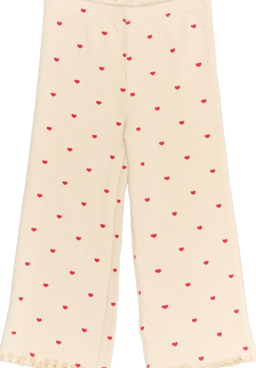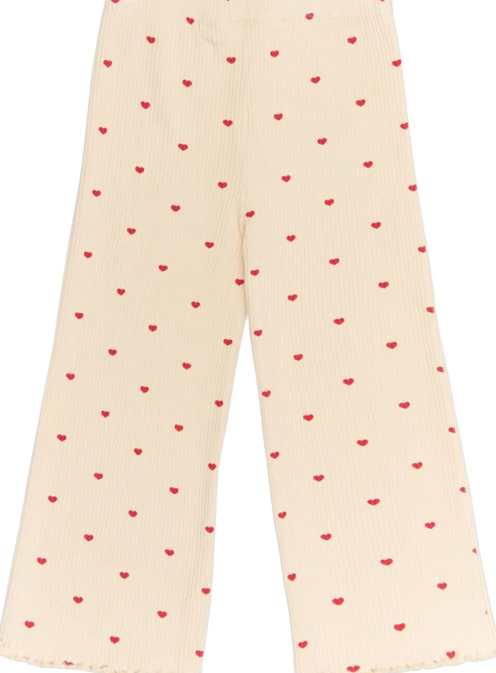Disse wide-leg ribbukser fra THE NEW Siblings er både legende og komfortable ideelle til hverdagsbrug med et stilfuldt twist. De har et charmerende all-over hjerteprint og feminine bølgede kanter ved anklerne, som tilføjer et sødt udtryk. Den bløde og strækbare kvalitet kombineret med en elastisk talje sikrer en behagelig pasform hele dagen. Kan matches med den tilhørende TNSTRhea Rib Tee for et komplet og koordineret look. – Wide-leg pasform – All-over hjerteprint – Elastisk talje – Bølgede kanter ved anklerne – Blød og strækbar kvalitet – Matcher med TNSTRhea Rib Tee – GOTS Organic, certificeret af Control Union, 842535.