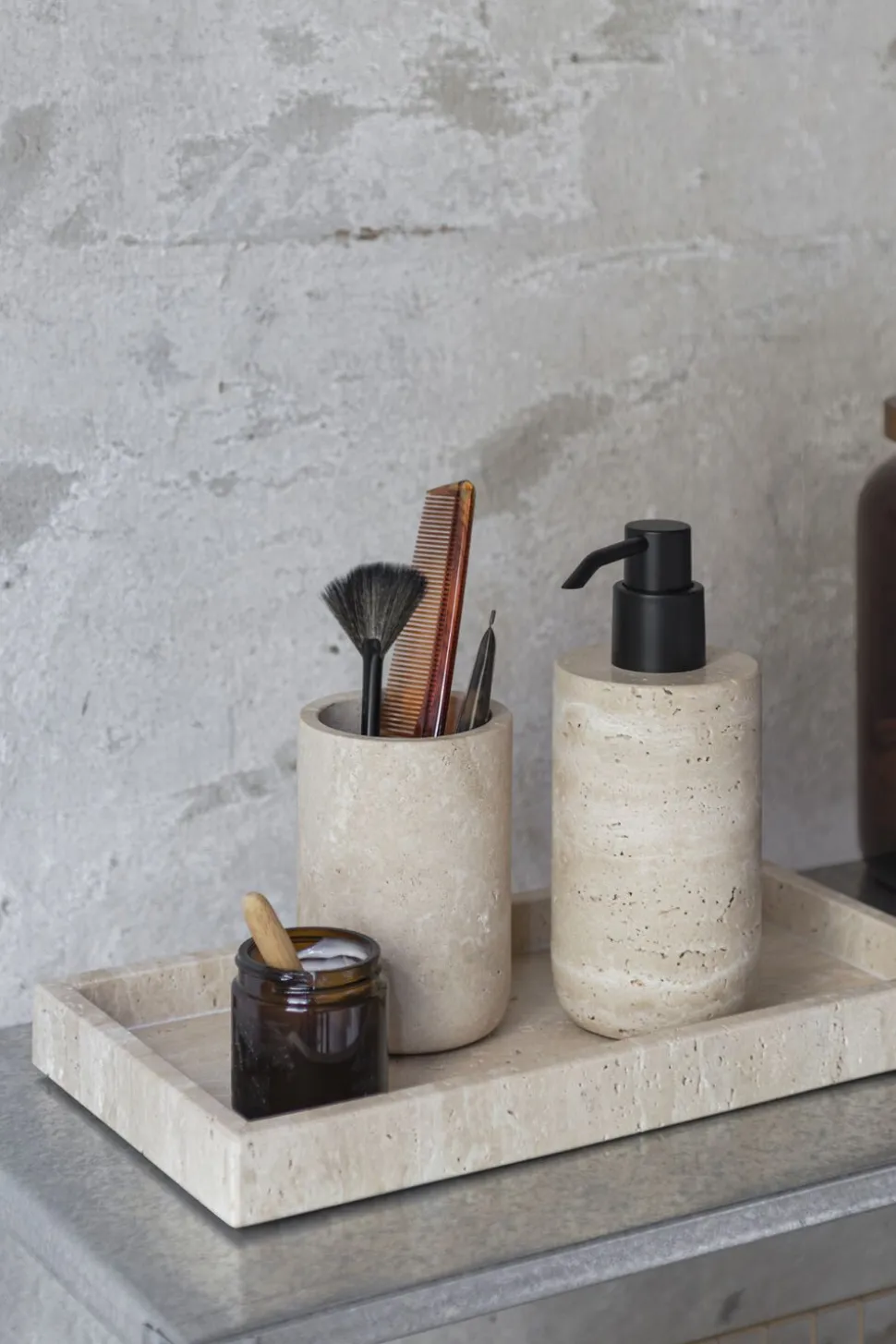 Hver tandbørsteholder er fremstillet af travertin, en natursten kendt for sine unikke mønstre og naturlige tekstur. Kombinationen af det robuste materiale og det enkle design sikrer et holdbart produkt, der både er praktisk i brug og elegant i sit udtryk.