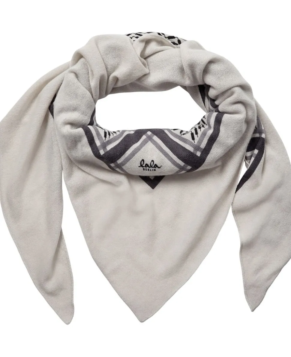 Et stort, luksuriøst blødt, trekantet cashmere tørklæde med et klassisk sort Kufiya-print.