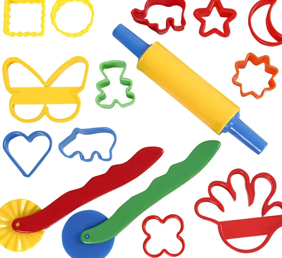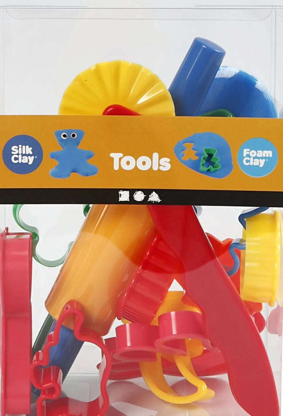 Sortiment med forskelligt værktøj og udstiksforme til ler, modellervoks osv.
