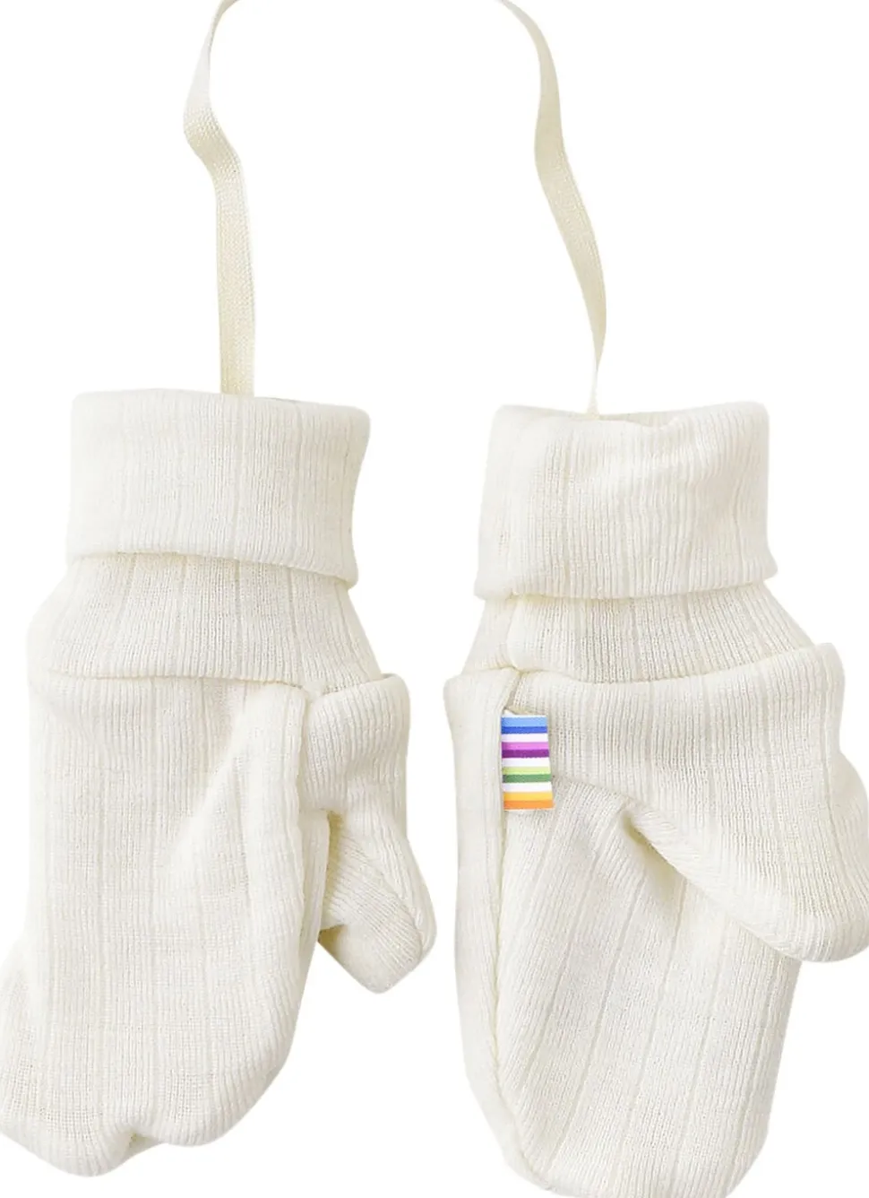 Dobbelt lags. Ensfarvet med ribkant ved håndled så de falder af. Hænger sammen med bånd så de ikke tabes. Blød, elastisk let uldkvalitet med lodret rille mønster. Ecolabel og Woolmark mærket.