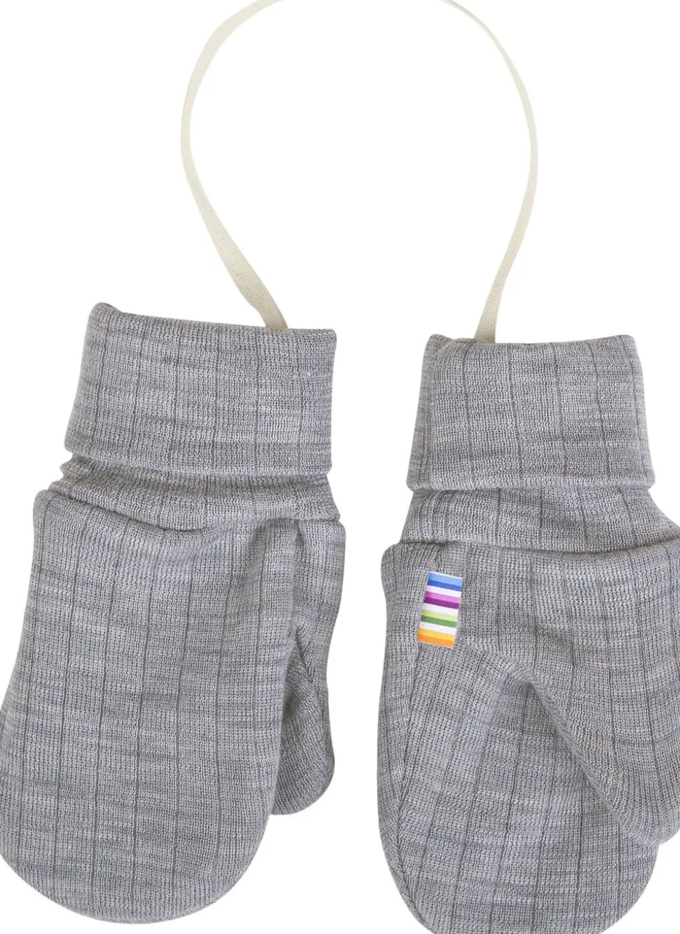 Dobbelt lags. Ensfarvet med ribkant ved håndled så de falder af. Hænger sammen med bånd så de ikke tabes. Blød, elastisk let uldkvalitet med lodret rille mønster. Ecolabel og Woolmark mærket.