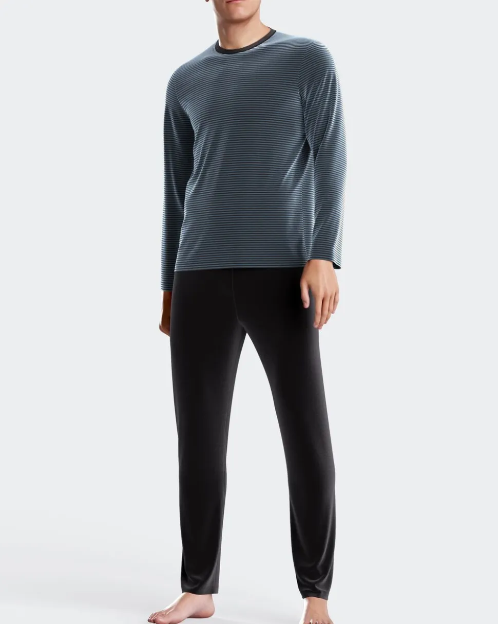 Velour termisk pyjamassæt bestående af en langærmet trøje med stribemotiv og ensfarvede bukser med baglomme.